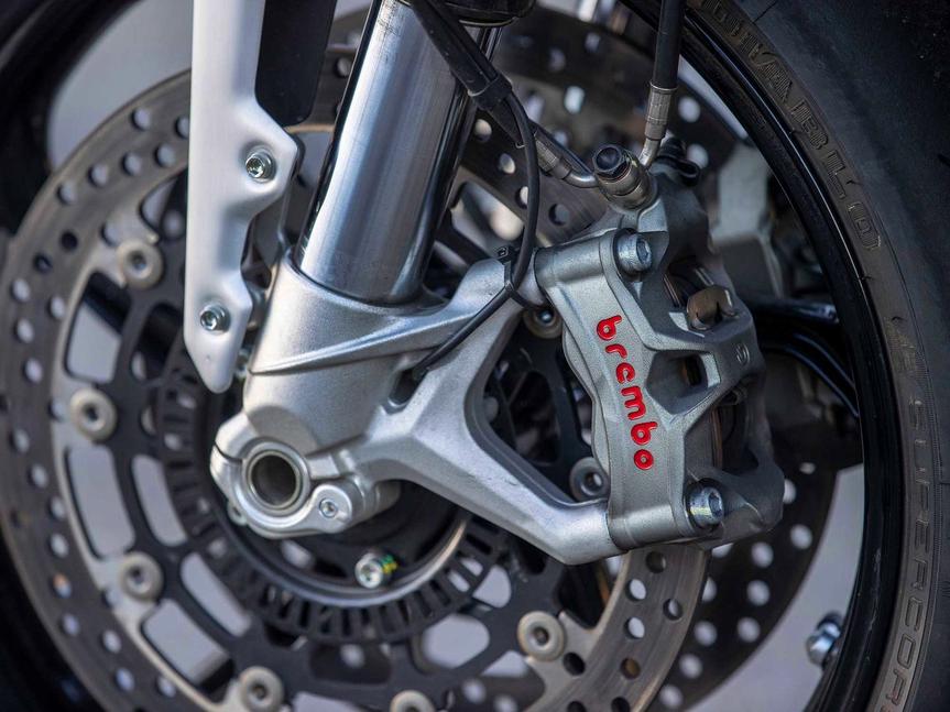 Решётчатая рама из хром-молибденовой стальной трубки обеспечивает предсказуемую устойчивость как на прямиках, так и на грани протектора, траекторию держит отлично и позволяет наслаждаться ездой. Когда всю эту красоту нужно осадить, тормоза Brembo с ABS с задачей справляются на отлично. Спереди стоят два моноблочных четырёхпоршневых Brembo Stylema на 320-х дисках, а сзади - двухпоршневой на 220-м. На асфальте этих тормозов хватает с лихвой, чувствительность обоих тоже на высоте, и они легко и предсказуемо замедляют 219-килограммовый мотоцикл без вмешательства ABS. Однако, испытания аварийного торможения показали, что с сотни он останавливается за 42 метра, а с 50 - за 10. Неплохо, но ничего особенного.
