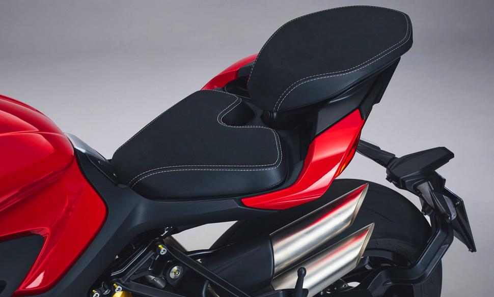 Новые подвески - не единственная плата за то, чтобы сделать Brutale 1000 RS удобнее, чем RR: посадка и сиденье тоже были переосмыслены. Несмотря на то, что новинка также оснащена клипонами, они на RS выше, чем кафе-рейсерные клипоны RR, что делает посадку более вертикальной. Соответственно, подножки тоже были перенесены на новые кованые алюминиевые крепления, а сами подножки тоже кованые и имеют новую конструкцию для большей цепкости. Сиденье получило новую более эргономичную форму и имеет набивку из пены двойной плотности.