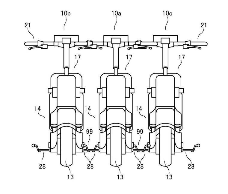 Вместо того, чтобы грузить их в фургон или кузов, Honda предлагает сделать так, чтобы скутеры можно было соединить вместе, чтобы один человек мог управлять целой группой. У подножек скутеров есть вторая секция, обычно находящаяся в сложенном состоянии, но если разложить её и соединить с нижней частью вилки другого скутера при помощи сцепного устройства (напоминающего фаркоп) и цангового захвата, то скутеры образуют жёсткую конструкцию. На эскизе, приложенном к патентной заявке, изображены четыре скутера, сцепленные вместе в форме ромба. Водитель, управляющий этой сцепкой, сидит на переднем скутере, с которого рулит всей сцепкой, а остальные катятся рядом и позади. Также скутеры будут иметь между собой электрическое соединение, так что все они смогут реагировать на движения ручки акселератора и даже на руление. Разумеется, при жёсткой сцепке наклоняться или поворачивать руль они не смогут, а вот снижать тягу на внутренней стороне сцепки при прохождении поворота и добавлять газу на внешней - другое дело.