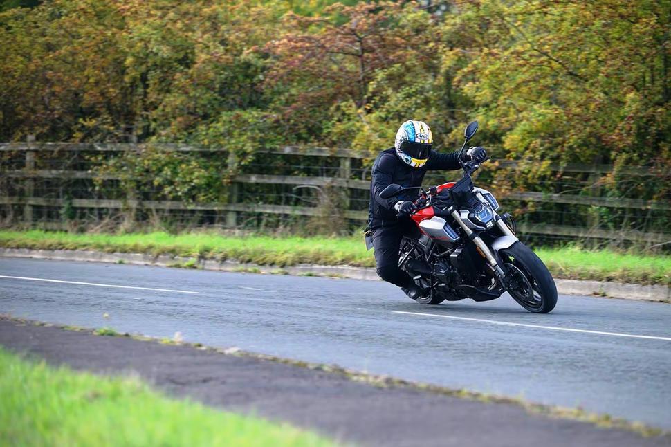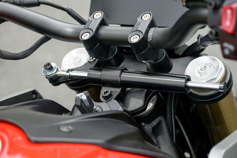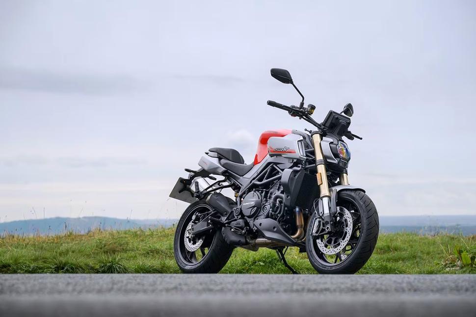 Кнопка стартера пробуждает суровый рык из выхлопа 2-в-1, выходящего высоко и проложенного за правой пассажирской подножкой. SRK звучит скорее как олдскульный V-твин, чем как рядная двойка Euro 5+, что объясняется его 270-градусным коленвалом. В Китае было создано немало копий европейских и японских моторов, но 904-кубовый восьмиклапанный двигатель SRK выглядит как собственная разработка компании. Диаметры и ходы поршней составляют 92x68мм, и из всех основных соперников ближе всего к нему снятый с производства KTM 890 Duke с его 90,7x68,8мм.