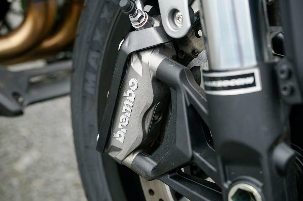 Обе подвески от Marzocchi полностью регулируются. Перевёрнутая вилка настраивается легко: на одном пере - сглаживание сжатия, на другом - отбой. Рулевой демпфер на верхней траверсе тоже регулируется. Два радиальных суппорта Brembo на 320-х дисках спереди - золотой стандарт современных высокопроизводительных мотоциклов, и единственный нюанс состоит в том, что ABS от Bosch не использует инерциальный блок, а значит, не учитывает углы наклона мотоцикла. Зато информативность и мощность переднего тормоза просто превосходны, а ABS ненавязчива. Литые 17-е алюминиевые диски обуты в шины Maxxis Supermaxx - консервативный, но вполне достойный выбор для спортивного нейкеда. И всё это оставляет невысказанный вопрос: на чём же QJMotor сэкономили при создании SRK900?