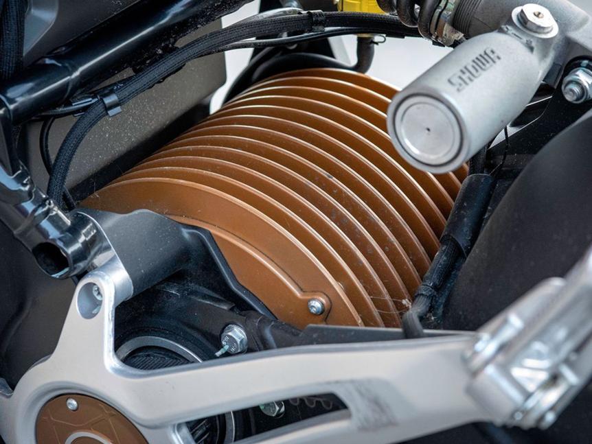 Проектируя аппарат "с чистого листа", конструкторы создали гладкий, функциональный дизайн с мощной батареей по центру. Он сильно отличается от неуклюжего облика старых моделей Zero S или SR. Но знаете что интересно? Не могу отделаться от мысли, что он похож на Honda CB650R Neo-Sport Café 2019 года. Даже окраска Boardwalk Red в чём-то перекликается с ней, особенно золотые колёса.