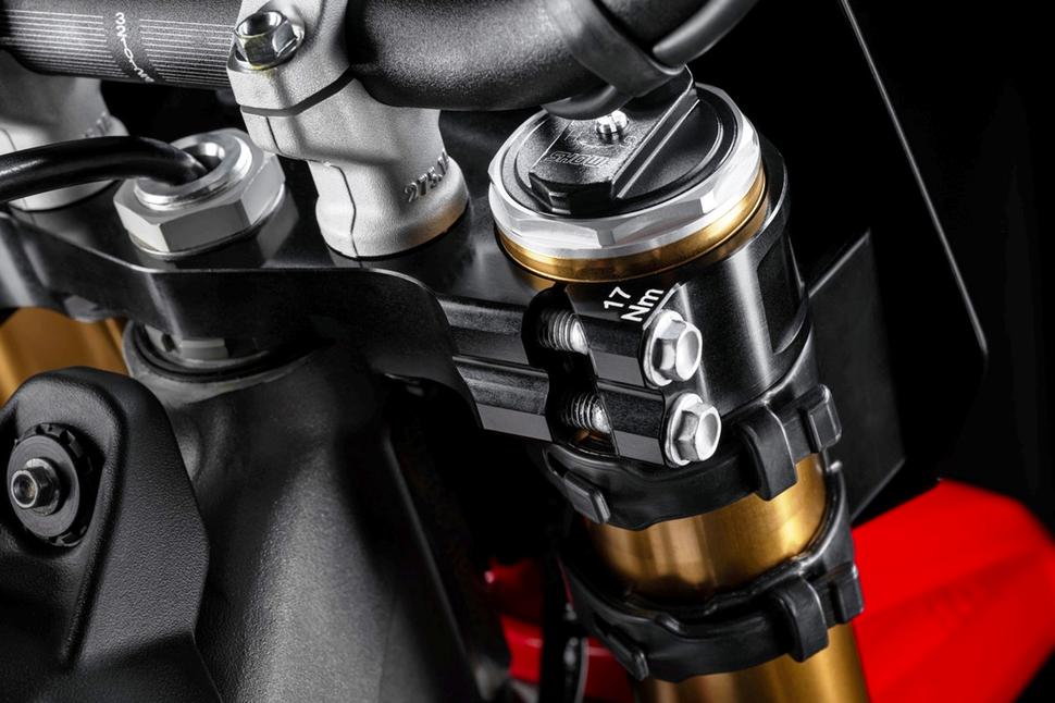 Подвески от Showa имеют ту же обработку, что и на мотоциклах заводской команды Ducati: закалка поверхности и отделка предназначены для снижения износа от камней и мусора, а также для более ровной и плавной работы с улучшенным поглощением ударов. Фрезерованные траверсы модели Factory легче стандартных примерно на 200 граммов и лучше передают обратную связь от передней подвески.