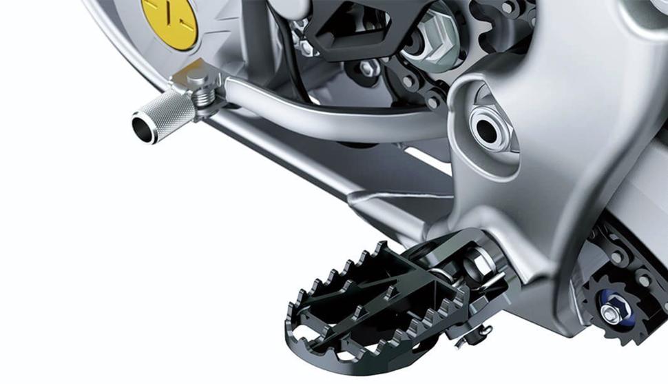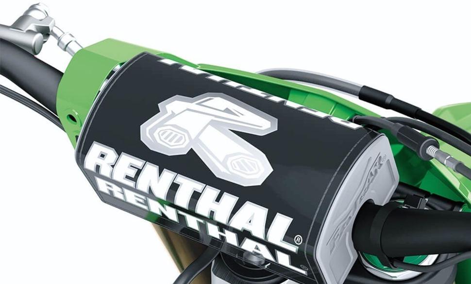 Руль на KX250 установлен на фирменную систему регулировки Ergo-Fit. Kawasaki KX250 2021 года оснащена толстым алюминиевым рулём толщиной 28 мм Renthal Fatbar - популярным вариантом тюнинга, который компания теперь поставляет в стоке. Система Ergo-Fit обеспечивает четыре варианта установки руля: два отверстия для установки с разницей в 35 мм и проставки, которые можно установить в двух положениях. Подножки также имеют два положения: стандартное и заниженное, которое ниже на 5 мм. Нижнее положение эффективно снижает центр масс в стойке и уменьшает изгиб коленей, что особенно актуально для высоких райдеров.