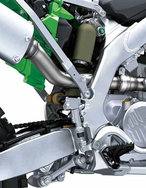 Задний амортизатор KYB с внешним резервуаром, покрытым Kashima, дополняет переднюю подвеску. Амортизатор имеет раздельную настройку быстрого и медленного сжатия. В задней подвеске системы Uni-Trak рычаг подвески расположен ниже маятника, что обеспечивает более длинный ход подвески. Характеристика рычага была обновлена и теперь соответствует характеристике подвески Kawasaki KX450, улучшая сглаживание. Обе подвески более точно настроены под новую раму и обеспечивают превосходное сглаживание ударов, а также отличное сцепление колёс с поверхностью.