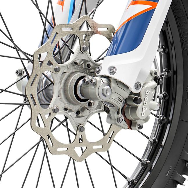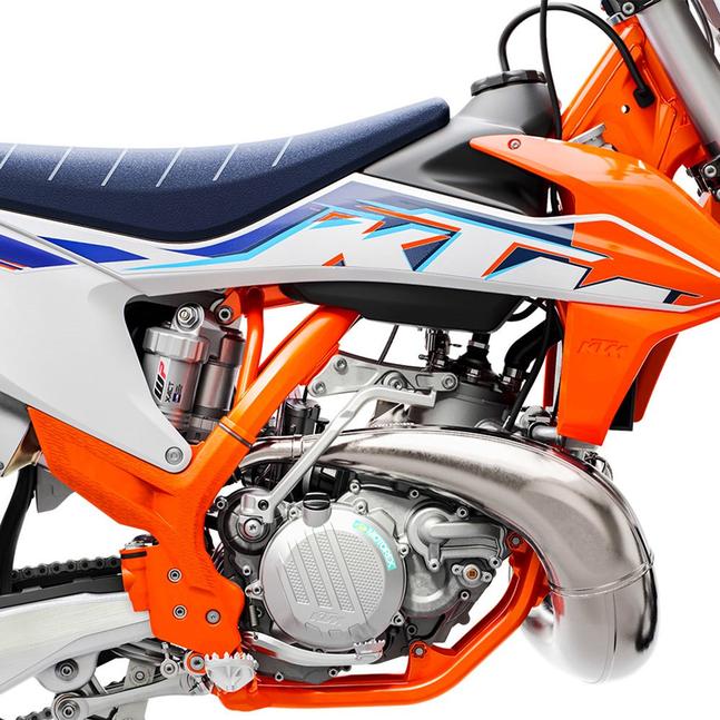 Несмотря на идею, что KTM 250 SX с каждым годом всё хорошеет и молодеет, механически версия 2022 года ничем не отличается от версии 21. Но есть пара эстетических моментов, которые KTM-овцы внедрили, чтоб не было скучно: они заменили чёрную раму на оранжевую, так что теперь KTM 250 SX соответствует в этом плане всей полноразмерной линейке, и, конечно же, нанесли новую, более яркую графику и даже обновили обшивку сиденья, которая теперь синяя. Кстати, стоит напомнить, что оранжевая рама говорит о том, что эта версия завершает срок жизни нынешней версии платформы, и в следующем (2023) году линейку ждёт очередной рестайл.