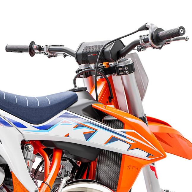 - Карты. Видимого переключателя карт на KTM 250 SX нет, но штатно в нём встроены две карты - стоковая и мягкая. Под левой стороной бензобака находится провод с белым пластиковым коннектором - его невозможно перепутать ни с чем, потому что это единственный белый коннектор. Стоковая карта считается “высокопроизводительной”, и большинство серьёзных райдеров едут именно с ней, но те, кто пока только изучает мотоцикл, будут рады возможности выбрать более плавный и менее агрессивный характер двигателя. Для этого следует просто разъединить белый коннектор под баком.