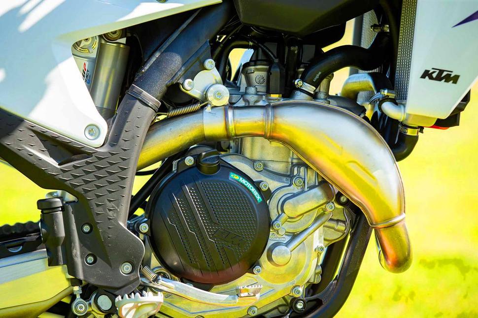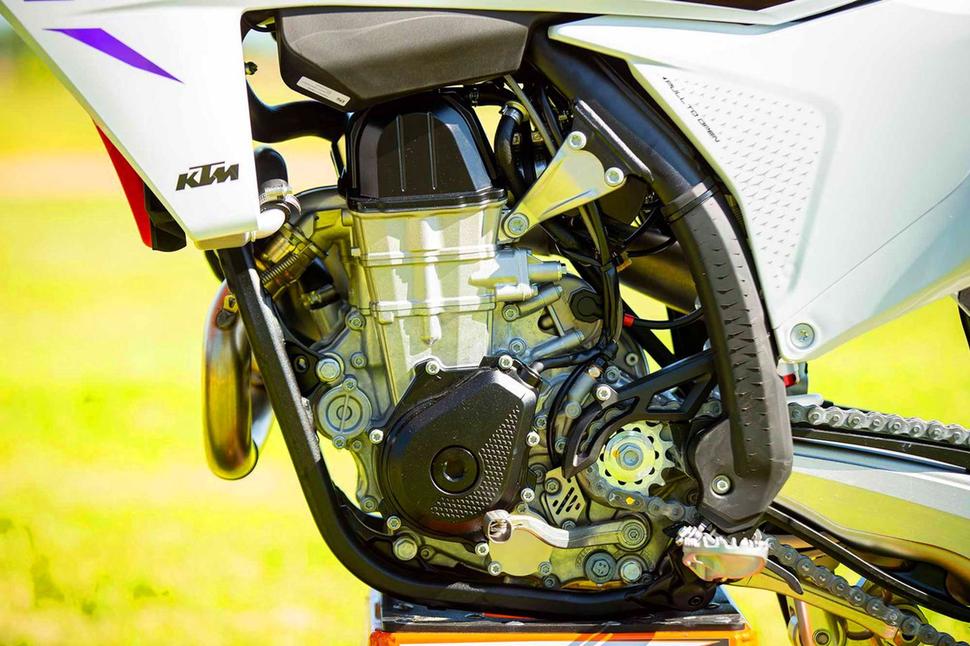 С самых низов и до верхов двигатель KTM 450 SX-F чрезвычайно уверенный и линейный: всегда знаешь, что получишь от него как в плане тяги, так и в плане отклика. Пожалуй, этот мотоцикл в своём классе имеет самую линейную характеристику - ни всплесков, ни провалов, KTM 450 SX-F тянет на уровне любого из соперников, особенно на трассах с хорошим зацепом. Только если одни 450-ки имеют сильные низы, а другие - мощные верха, то кроссовый флагман KTM тянет снизу доверху, причём с прекрасной удобной характеристикой, которая не вырвет вам руки и не сорвёт колесо без вашего на то желания. При этом он более чем способен на любой прыжок и на мощный отстрел со старта. Агрессивный райдер оценит прекрасные верха, и чем сильнее ты на нём наваливаешь, тем лучше он работает. Это не значит, что он не подойдёт начинающему райдеру - его удобную характеристику сложно назвать пугающей по меркам кроссовых 450-к.