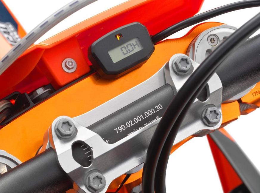 - Фрезерованные на станках с ЧПУ раздельные траверсы с оранжевым анодированием Factory Racing держат перья вилки идеально выравненными и имеют возможность простой регулировки выноса траверс относительно рулевой колонки (с двумя положениями, 20 и 22мм). Ось рулевой колонки имеет оптимальную жёсткость, новые крепления руля обеспечивают улучшенный зацеп для минимизации вероятности проворачивания и позволяют устанавливать руль как жёстко, так и с резиновыми проставками для дополнительного демпфирования. Кроме того, крепления руля затягиваются без необходимости снятия руля.