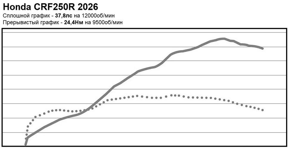 На 2026 год механических изменений в CRF250R не было, и на диностенде она показала те же 37,8лс на 12000об/мин и 24,4Нм на 9500об/мин.
