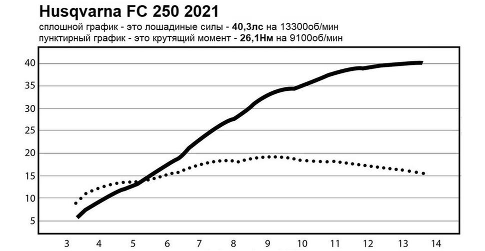 Несмотря на менее агрессивный по сравнению с 250 SX-F характер на трассе, Husqvarna FC 250 выдаёт ровно те же цифры мощности, что и KTM, практически во всём диапазоне оборотов. Более того, Husqvarna выдаёт даже больше лошадиных сил, чем 250 SX-F, в промежутке с 8800 до 9800об/мин, и лишь чуточку меньше - с 11000 до 11500 и с 11900 до 12500. 250 SX-F начинает доминировать с 12700 и вплоть до достижения максимальной мощности в 41,1лс на 400 оборотов выше, чем FC 250. В свою очередь Husqvarna FC 250 2021 выдаёт 40,3лс на 13300об/мин и максимальные в своём классе цифры крутящего момента - 26,1Нм на 9100об/мин.