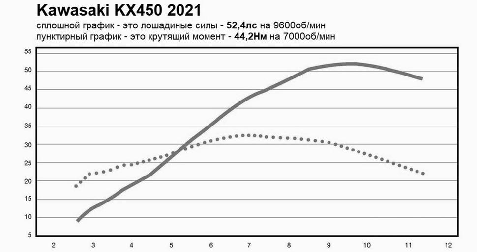 Любой из шести кроссовых 450-кубовых мотоциклов крупных производителей производит более чем достаточно мощности для большинства райдеров. Но вот отклик двигателя, характер распределения мощности и график крутящего момента делают тот или иной мотоцикл предпочтительнее для конкретного человека. Kawasaki KX450 2021 добились великолепного баланса. С 2019 года флагманский кроссовый мотоцикл Зелёных в изобилии выдавал полезную и управляемую мощность, в сочетании с быстрыми низами и ультра-чётким откликом на газ. И несмотря на меньшее количество лошадиных сил и Ньютон-метров, чем у Honda CRF450R, Husqvarna FC 450 и KTM 450 SX-F в диапазоне с 6000 оборотов в минуту и до конца, KX450 не теряет популярности и любви. Пиковые цифры, выданные Kawasaki KX450 2021 на диностенде, составили 52,4лс на 9600об/мин и 44,2Нм на 7000об/мин.