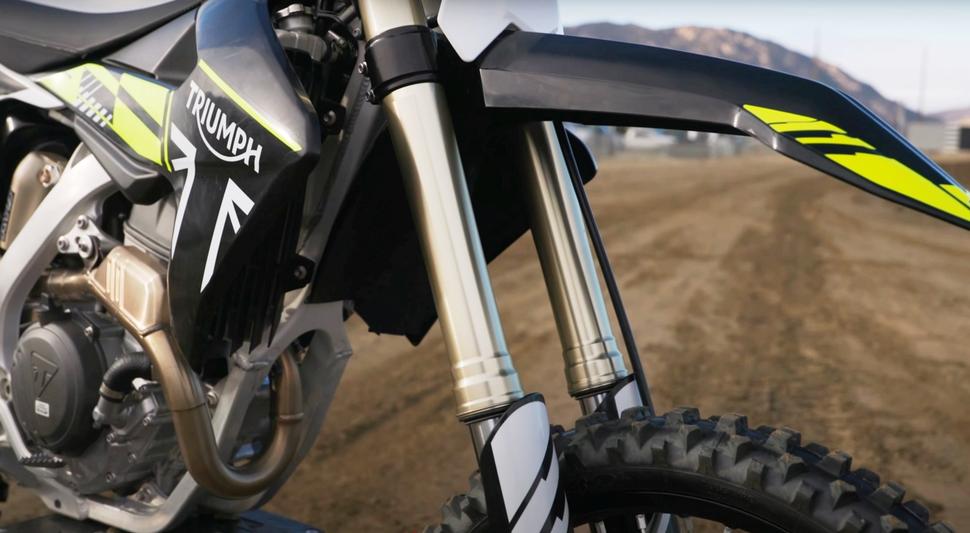Сразу чувствуется, что подвески Triumph настроены несколько жёстче, чем у других четырёхтактных кроссовых 250-к. Они больше предназначены для гонщиков, чем для спокойной езды, и их даже пришлось расслабить, немного освоившись с мотоциклом. 48-я пружинная вилка KYB AOS с закрытыми картриджами после распускания сжатия на четыре щелчка стала значительно комфортнее на участках с мелким битьём, которое неплохо так отдавалось в запястьях со стоковыми настройками. Этого изменения оказалось достаточно на весь день, даже когда на трассе появились более крупные неровности.