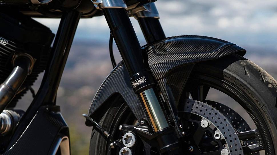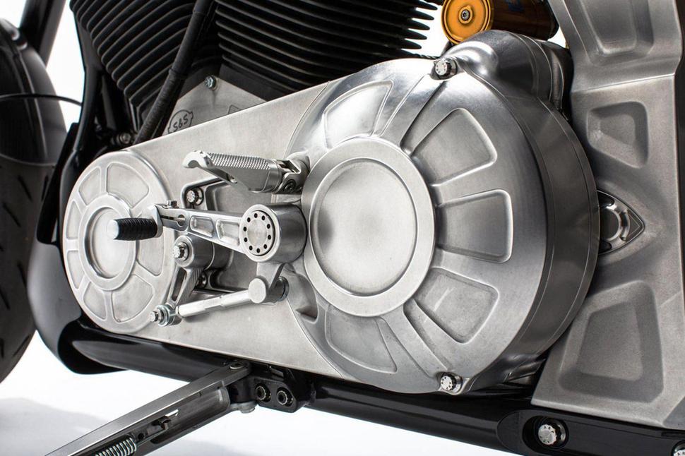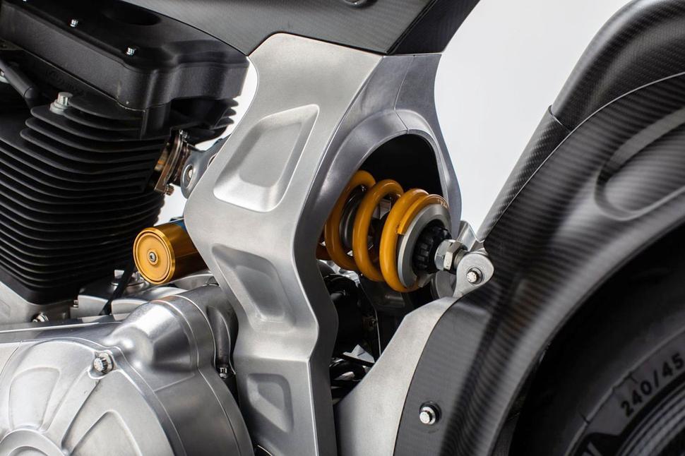 Более того, речь идёт ровно о той же модели двигателя, что и в KRGT-1, а вот шасси и спортивная эргономика у Arch 1s - новые. Угол рулевой колонки круче, колёсная база короче, а ездит 1s на карбоновых 17-дюймовых колёсах с совершенно новым односторонним маятником, в честь которого модель и получила своё название: односторонний по-английски - это 1-sided. Ну а огромный (124 кубических дюйма или 2032куб.см) V-твин делает езду на этом мотоцикле на удивление расслабленной, если есть такое желание.