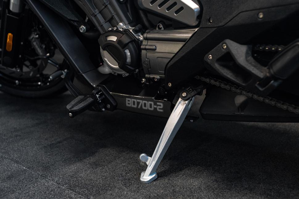 Ну и раз речь зашла о ходовке Benda LFC 700, то отсюда и продолжим. Перевёрнутая вилка от KYB регулируется по сжатию и отбою, а задний моноамортизатор - по сжатию и преднатягу. К амортизатору подвешен внешне массивный, но лёгкий алюминиевый двухсторонний маятник сложной формы, на котором консольно вынесен кронштейн номерного знака. Над маятником начинаются интересной формы боковые панели, поддерживающие седло и переходящие в облицовку бака. Двигатель силуэтно напоминает V-твин, вернее, только переднюю его сторону , но вместо одного котла под привычным углом установлены четыре с рядной компоновкой, присущие скорее спортбайкам и динамичным дорожникам, чем круизёрам. Не менее спортивно выглядит и облицовка радиатора, переходящая в плуг снизу и в бак сверху. Нижняя часть пластика переходит в коробку выхлопа, оканчивающуюся рядом почти квадратных раструбов - к сожалению, не огнедышащих из-за современных эконорм, но всё равно эффектных.