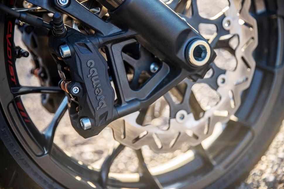 Для своего веса мотоциклы Harley Davidson всегда обладали достаточно информативными тормозами, и ST продолжает эту традицию. Четырёхпоршневые суппортf Brembo работают на 320-миллиметровых плавающих дисках, обеспечивая мощное и предсказуемое торможение без лишней суеты. Рычаг информативен, модуляция лёгкая, тормоза эффективны даже на высоких скоростях. На ходу ты просто забываешь о тормозах, воспринимая их как само собой разумеющееся и без каких-то ярко выраженных особенностей, и по сути, от них это и требуется.