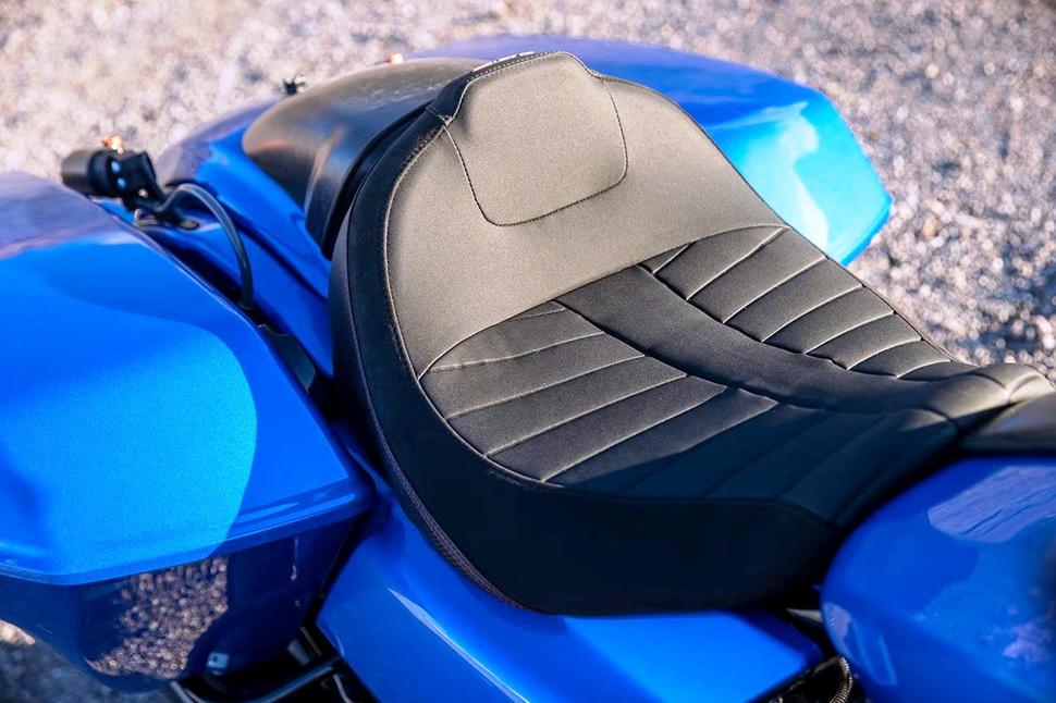 Сиденье Harley Davidson CVO Street Glide ST 2026 заслуживает отдельного упоминания. Оно обеспечивает хорошую поддержку, имеет выраженную опору для поясницы при спокойной езде, но при этом его передняя часть достаточно гладкая и зауженная, чтобы облегчать перемещение. На шоссе можно устроиться поудобнее, вытянув ноги вперёд, и расслабиться. На извилистых участках оно никогда не мешает и не ограничивает спортивные движения.