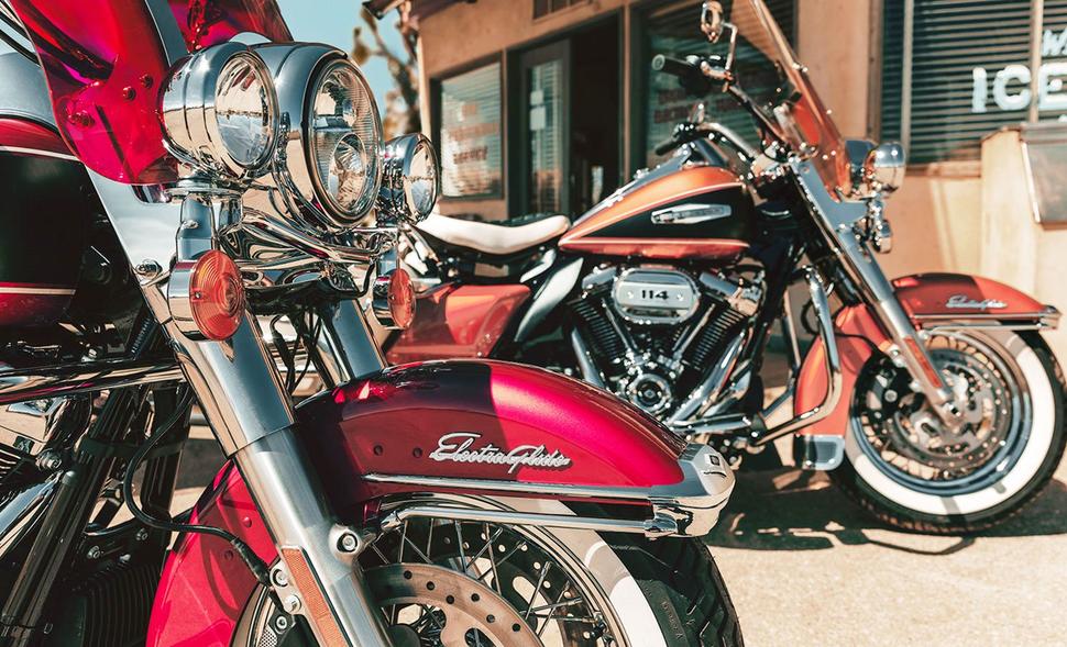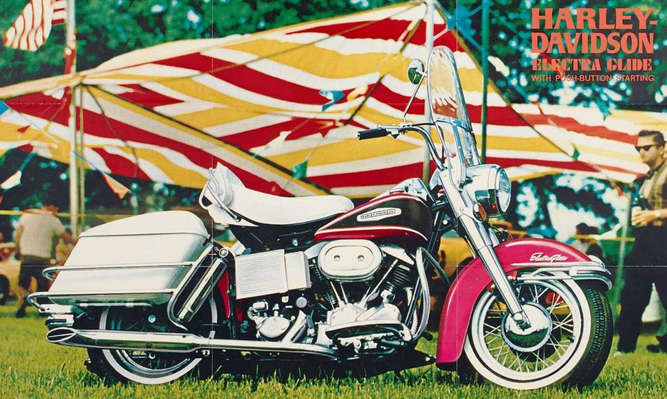 Electra Glide 1968 года вызывает яркую ностальгию по старой доброй Америке. Она несёт на себе следы эпохи - белый основной тон с пурпурными и хромовыми акцентами. Также она выпускалась в люксовой туринговой комплектации King of the Highway - Король Шоссе, на минуточку. В неё входили стеклопластиковые кофры, ветровое стекло, багажник и дуги, и вот как раз отсюда и происходит нынешний Highway King.