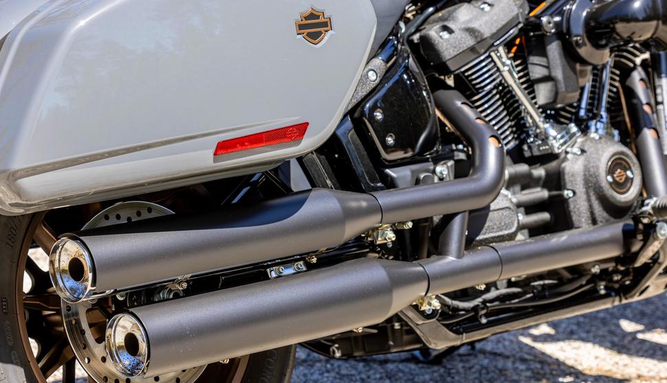 Вот к выхлопу есть вопросы: сами глушители и их крепёж хромированы, но скрыты под чёрными кожухами, и выглядит это странно, как какая-то перелицовка на скорую руку. Особенно такое решение привлекает внимание к хромированным торцам глушителей, которые выглядят достаточно неказисто. В остальном же мотоцикл в части мотора выглядит здорово, как и ожидаешь от Milwaukee-Eight.