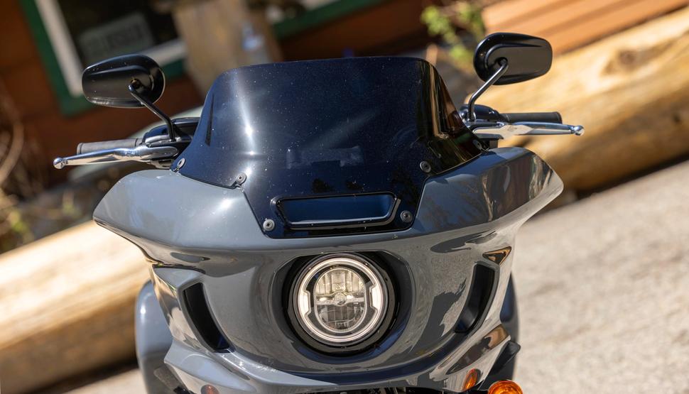 Уже только ленивый не высказался по поводу переднего обтекателя по мотивам FXRT. Надо сказать, дизайнеры действительно хорошо поработали над тем, чтобы он остался узнаваемым, но эффективным по современным стандартам. Обтекатель сохранил круглую фару и "жабры" вентиляционных отверстий по бокам, но сейчас благодаря вычислительной газодинамике и тщательному тестированию обтекатель не только выглядит, но и работает впечатляюще. На скорости через два боковых отверстия и одно верхнее над фарой на райдера направляется ровно нужное количество воздуха, так что он находится в пузыре относительно спокойного, не шумного, но свежего воздуха, обдувающего и защищающего его. Стандартный ветровик идеален для роста около 180см, даже на скоростях, в которых не стоит признаваться вслух. Боковой ветер переставить такой мотоцикл не способен, так что он даже и не пытается.