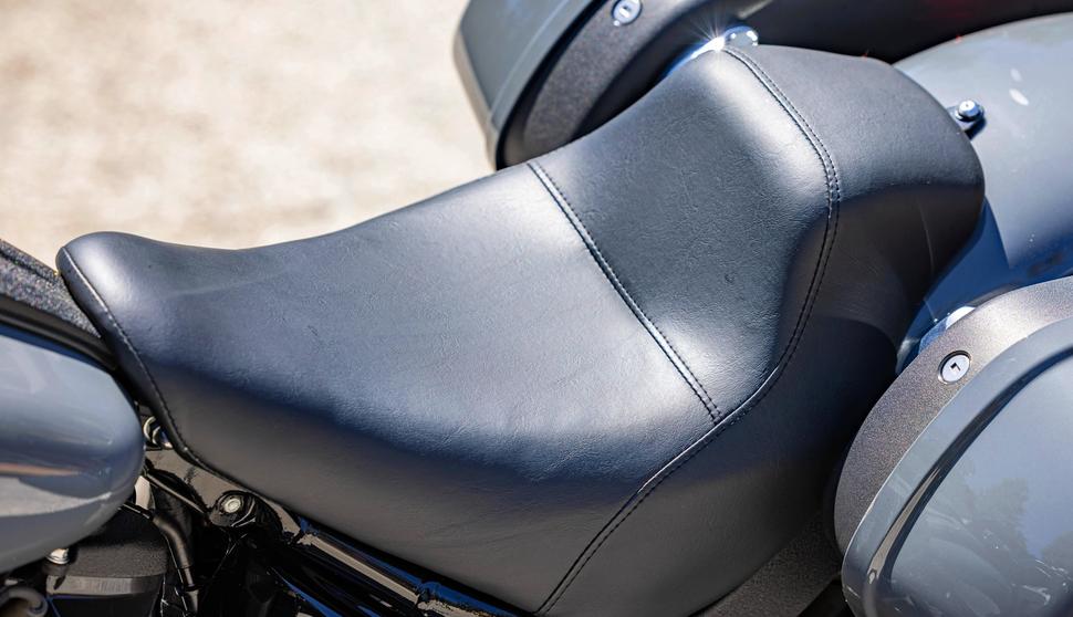 Но и сиденье очень важно, и на Harley Davidson Low Rider ST оно само по себе очень хорошее - мягкое, удобное в дальнобое, а его форма предотвращает скатывание назад на открытии газа. В этом седле можно с удовольствием проводить часы напролёт. Руль, кстати, удобен не только для вальяжного наматывания километров на колёса, но и для бодрого руления на извилистых дорогах. А вот с посадкой спецы HD не угадали - когда колени расположены так высоко, да ещё и спина чуть согнута вперёд, разминаться приходится довольно часто. Такая посадка хороша для активной езды, но не для дальнобойного туризма, и скорей всего даже наличие круиз-контроля бы не улучшило ситуацию - каждый час-полтора большинству обычных райдеров пришлось бы вставать на обочине и потягиваться. Возможно, невысоким райдерам было бы удобнее в плане ног, но пришлось бы сильнее тянуться к рулю.