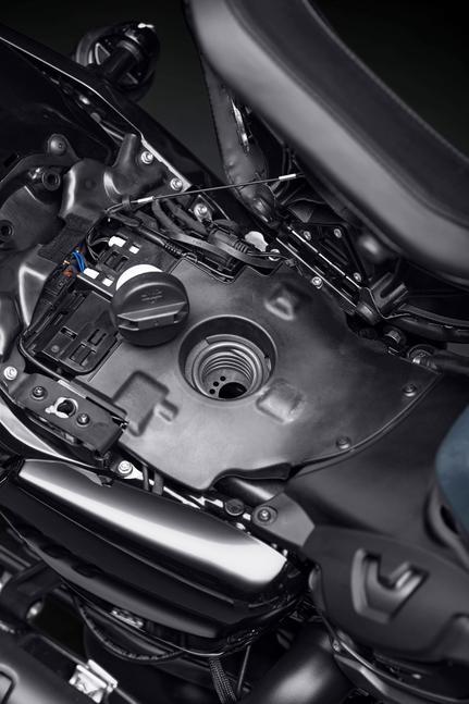 Например, то, что выглядит как бензобак, на самом деле является корпусом воздушного фильтра, а настоящий бак находится под седлом, позади боковых крышек. Такое расположение 11,7-литрового пластикового бензобака позволяет разместить ниже центр масс мотоцикла и одновременно увеличить объём аирбокса. Заправляется мотоцикл через горловину под откидывающимся сиденьем. Бензобак его чуть меньше, чем у Iron 883, и хотя расход снижен до 4,5 литров на сотню, ориентировочный запас хода Nightster равен 260км против 270 у Iron.