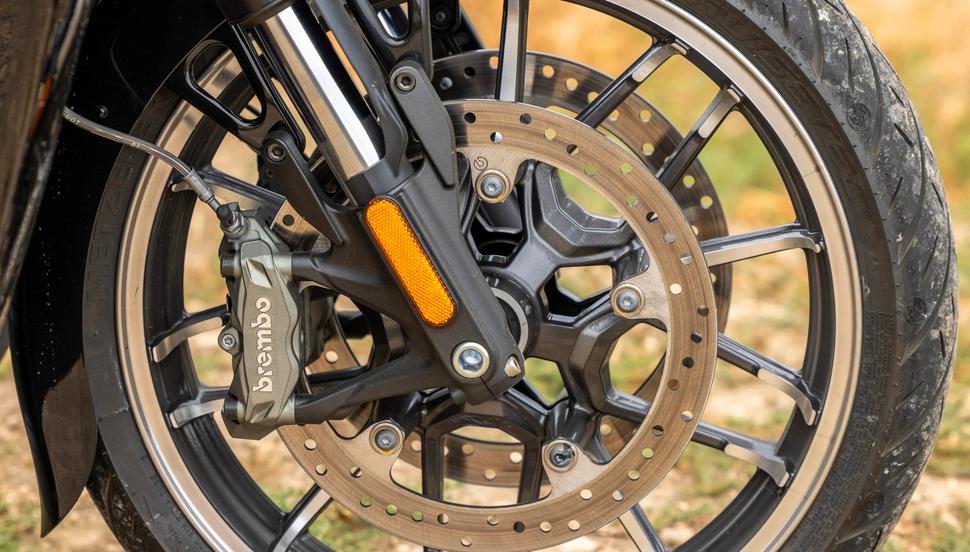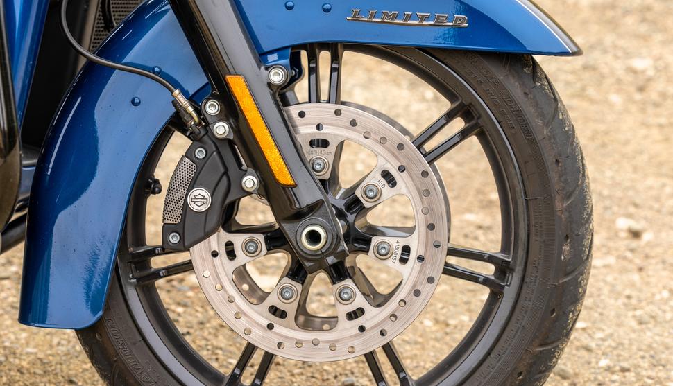 Удивительно, насколько хорошо Harley себя ведёт на ходу, будь то спокойная езда по прямой или череда перекладок на серпантине, несмотря на старомодные две стойки сзади и 8 сантиметров хода заднего колеса. Амортизаторы имеют регулировку преднатяга, но когда до этого катался на Pursuit с настройкой через меню, лезть напрямую к пружинам уже неохота. 49-я вилка HD Road Glide с двойными изгибающимися клапанами справляется очень неплохо, и всё вместе безмятежно несёт вас вперёд.