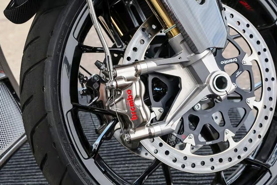 Корзина сцепления на этом двигателе выполнена на ЧПУ-шном фрезере из литой заготовки, и вместе с коробкой King 6 она разработана гоночной командой HD. Останавливают этого монстра ровно те же тормозные диски Brembo T-Drive и никелированные суппорта Brembo GP4-RX, которыми пользуются Кайл Уайман и Джеймс Рисполи.