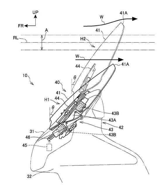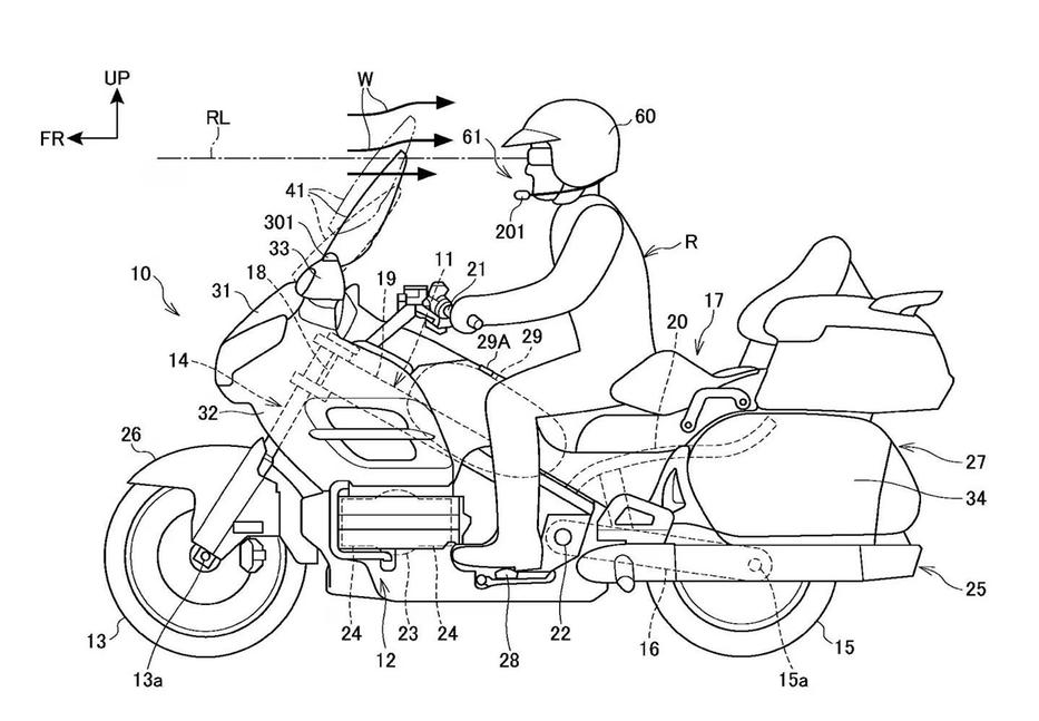Патентная заявка, поданная Honda в Японии, описывает ветровое стекло с автоматической регулировкой. На шлеме райдера размещается микрофон (хотя в других патентах Honda упоминается микрофон для систем голосового управления, установленный на бензобаке), а на зеркалах - пара камер, обращённых к райдеру. Микрофон, камеры и пульт на руле передают в ЭБУ необходимую информацию, а он в свою очередь управляет ветровиком с помощью той же системы электропривода, что была представлена на Gold Wing 2018 года.