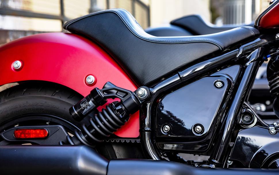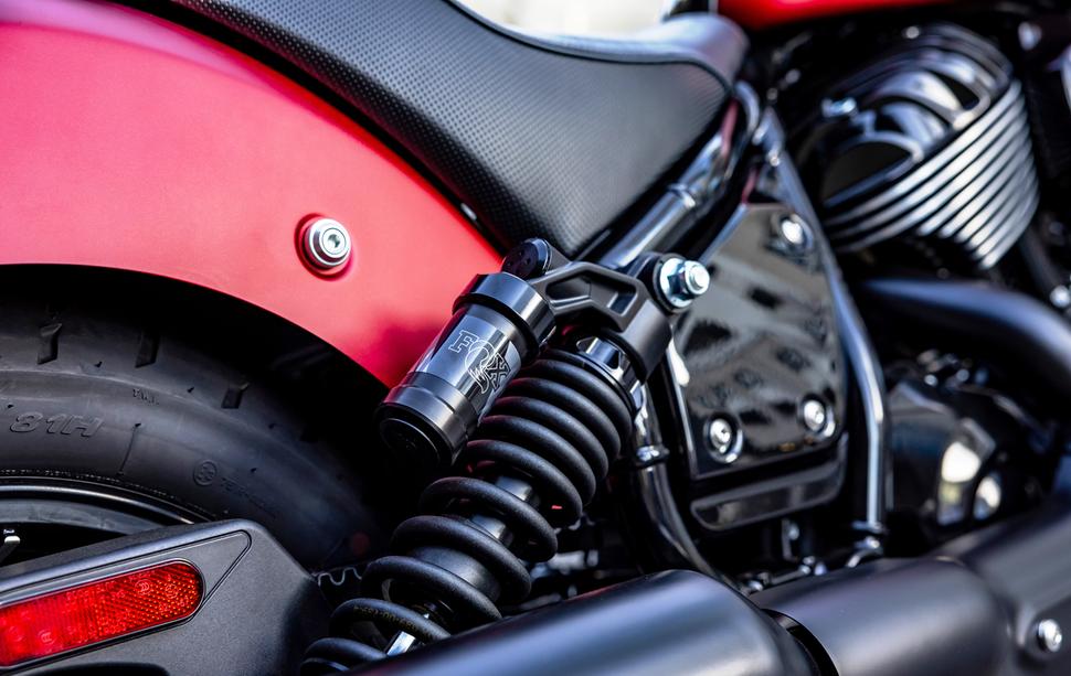 Рецепт Indian Sport Chief довольно прост: берём стандартный Chief и делаем так, чтобы он лучше управлялся и тормозил. Как этого добились ребята из Indian? Для начала заменили подвески: Indian в сотрудничестве с Fox разработали два амортизатора с выносным резервуаром и ходом 10см (Это на три сантиметра больше, чем у стандартного Chief). Регулируется у них только преднатяг пружин, но дорогого стоит сам факт того, что разработчики наконец-то поставили во главу угла ход подвески, а не низкое седло. Наконец-то задняя шина может огибать неровности вместо того, чтобы передавать через сложенный амортизатор каждую кочку и яму напрямую в позвоночник. Если же для вас важны настройки сжатия и отбоя, то в каталоге Indian есть ещё более крутые амортизаторы Fox с такой возможностью.