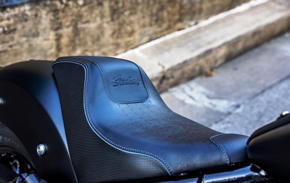 Посадка на Indian Sport Chief включает подножки среднего расположения, одиночное сиденье Gunfighter и, что наиболее важно, шестидюймовые (это 15см) проставки руля. У стандартного Chief руль стоит непосредственно на верхней траверсе. По каталогу доступны также 10-дюймовые (25см) и 4-дюймовые (10см) проставки, заниженное водительское седло и даже пассажирское сиденье с подножками. Так что недостатка в вариантах посадки и конфигурации тут нет. Что касается небольшого обтекателя, то он штатно оснащён 15-сантиметровым ветровиком, но также доступны более высокий и более низкий вариант, с расширением или без него.