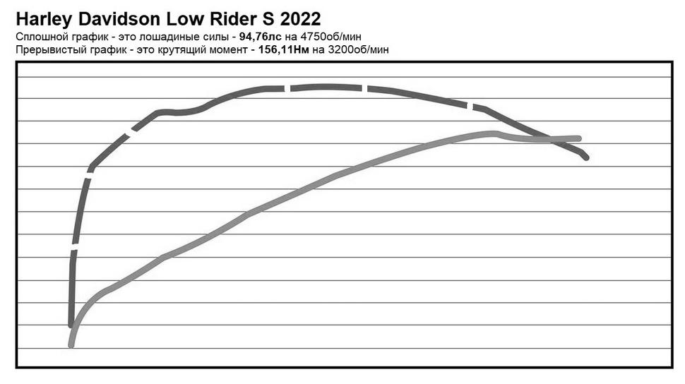 На диностенде Harley Davidson Low Rider S 2022 года выдал в пике 94,76лс на 4750об/мин и 156,11Нм на 3200об/мин, что представляет собой примерно 14-процентный прирост пиковой мощности и небольшой - в пике тяги. Впрочем, достаточно и этого: практически сразу с холостых оборотов и вплоть до самой отсечки доступно более 100 ньютон-метров, а уже с 2000об/мин наступает практически ровная полка момента, которая до 4500 не опускается ниже 140Нм, и, в отличие от 114-го Milwaukee-Eight, не имеет такого резкого падения ближе к отсечке. Так что пиковые значения - это не главное.