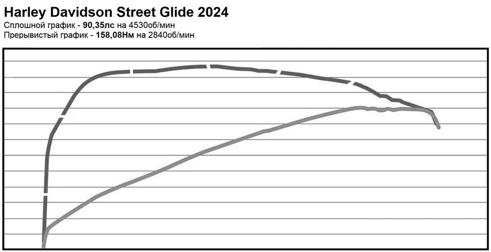 На диностенде Harley Davidson Street Glide 2024 года показал пиковые 90,35лс на 4530об/мин и 158,08Нм тяги на 2840об/мин. Для сравнения, Harley Davidson Road Glide CVO Limited Anniversary Edition выдал на том же стенде 90,11лс на 4660об/мин и 150,8Нм на 3290об/мин при том же рабочем объёме.