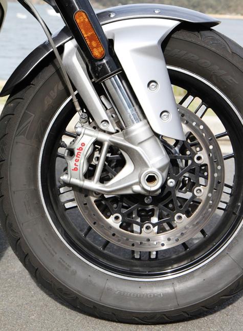 Не менее важны для такого большого мотоцикла и тормоза, и у Rocket 3 GT с этим тоже полный порядок. Они информативны, позволяют тормозить поздно (по круизёрным меркам, конечно) на входе в поворот и эффективно останавливают при аварийном торможении. Спереди на Triumph Rocket 3 стоят два 320-х диска с четырёхпоршневыми радиальными моноблочными суппортами Brembo M4.30 Stylema, а сзади - один 300-миллиметровый диск с моноблочным четырёхпоршневым Brembo M4.32. Оба контура оборудованы фирменной наклонной ABS от Triumph.