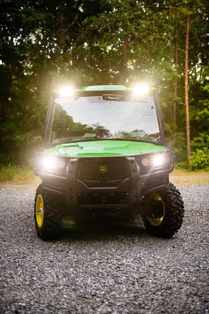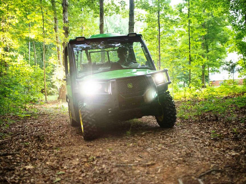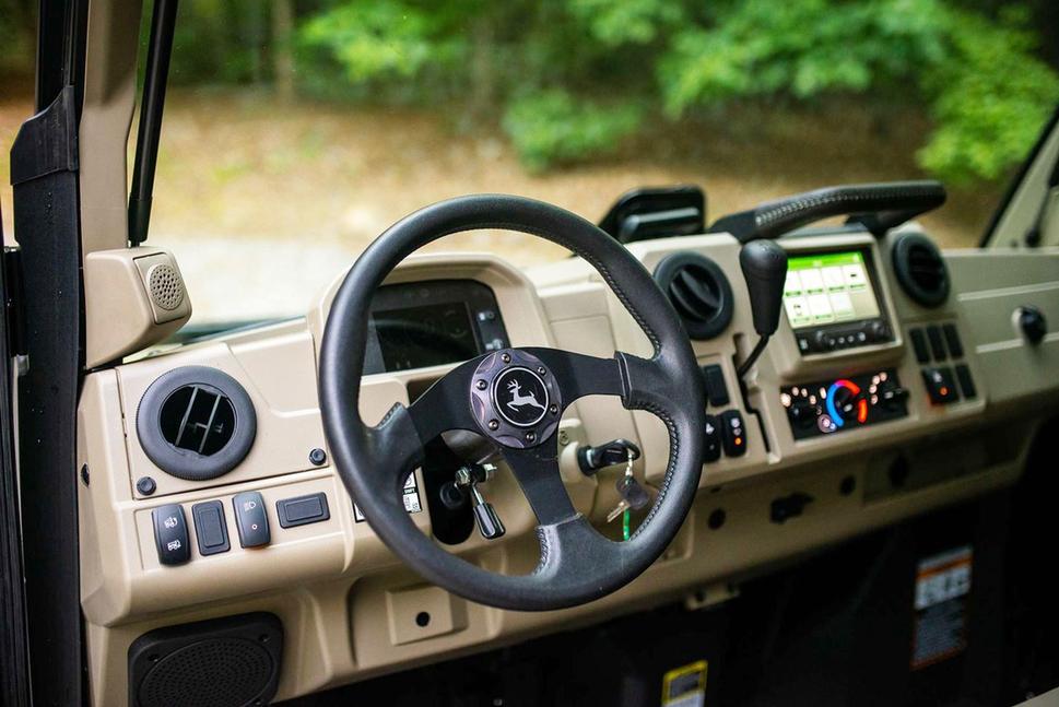 Кому-то может показаться, что самосвальный кузов с электроприводом - это не роскошь, и для таких скептиков у John Deere есть неплохой список других лакшери-фишек. В топовой версии Signature Edition 835R имеется 5,5-дюймовый информационно-развлекательный центр с сенсорным экраном, акустическая система на семь динамиков и даже обшивка сидений из искусственной кожи. Изнутри кабины Gator кажется первоклассным американским пикапом, с вот этой вот полувоенной простотой дизайна, жёстким пластиком песочного цвета и вставками "роскоши" вроде кожаной оплётки руля и поручней.