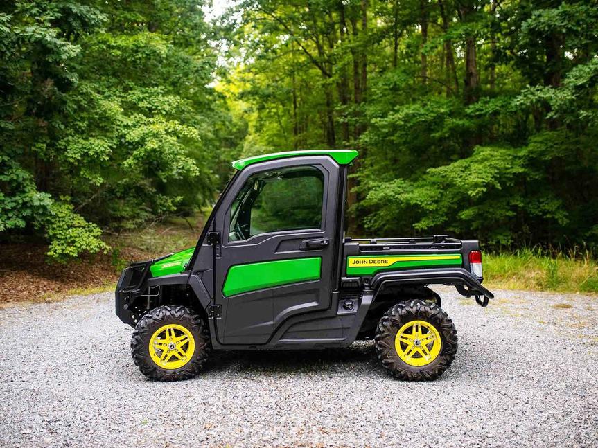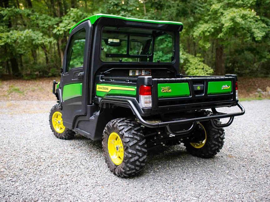 Да, в это сложно поверить тем, кто застал эпоху автомобилей без кондиционера (а то и с необходимостью включать летом отопитель салона, чтобы не перегреть движок), но Gator, утилитарный двухместный багги, не просто оборудован закрытой кабиной, но и имеет штатный кондиционер (наряду с другими люксовыми опциями). Так, John Deere создали впечатляющую систему электроусилителя рулевого управления, электрическую блокировку заднего дифференциала, прочные защитные пластины на днище и то, чего не хватает многим и многим утилитарным вездеходам - откидной кузов на электроприводе.