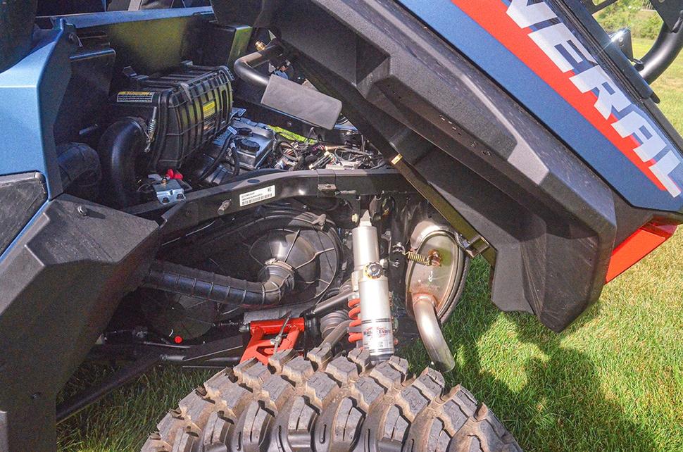 Не зря Polaris General называют спортивно-утилитарным вездеходом, или кроссовером. У них более длинный впускной тракт, чем у RZR S4 1000 и отличаются настройки ЭБУ и вариатора, но General чрезвычайно быстры на верхах и при этом очень мягко едет при аккуратной работе газом. Они даже издают те же агрессивные завывания трансмиссией, когда работаешь газом на нейтральной передаче, что и RZR XP 1000. 999-кубовый 100-сильный твин ProStar выдаёт отличную тягу, запросто проворачивая большую резину, а пониженная передача великолепно подходит для узких, сложных мест, на максимальных оборотах разгоняя Polaris General до 60км/ч (верхняя - до сотни).