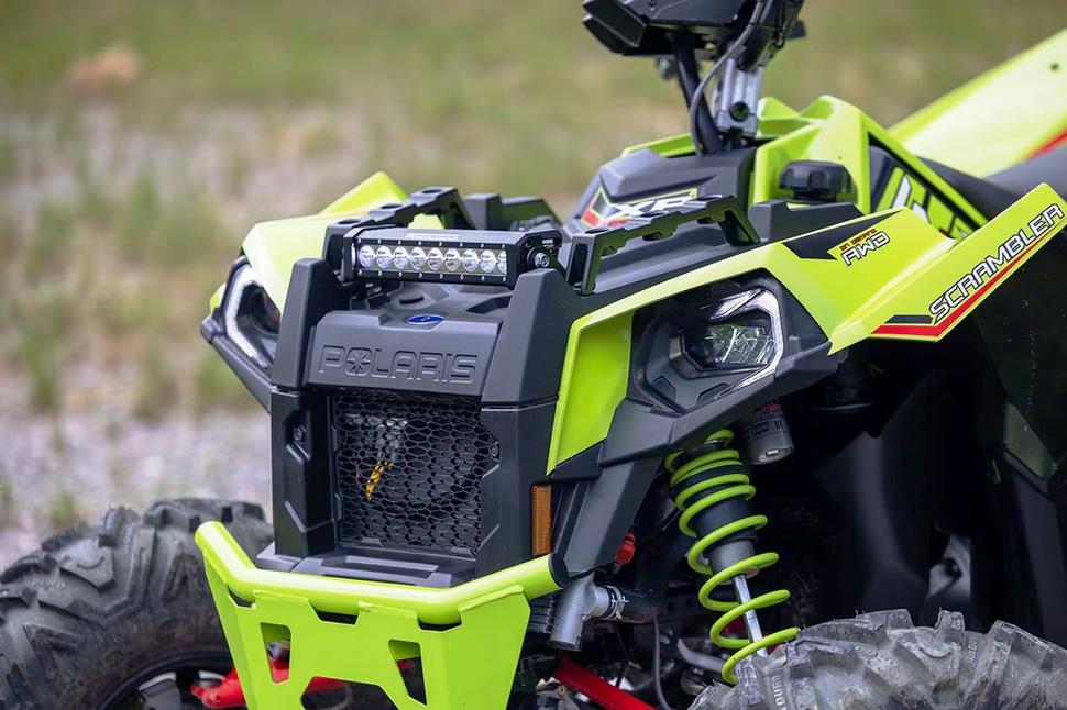 Scrambler XP 1000 S - мощный квадроцикл, и это сразу видно по нему. Он имеет агрессивный дизайн с острыми гранями и углами, а ярко-зелёный цвет и форма фар, взятая у первого поколения Polaris RZR XP 1000, делает его весьма спортивным.