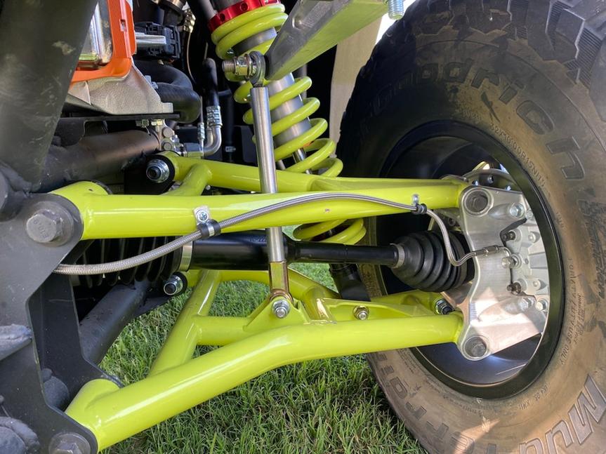 На всех четырёх колёсах стоят мощные двойные А-образные рычаги, дающие 35см хода подвесок. Большие передний и задний рычаги поперечной устойчивости отлично предотвращают крен. Что касается поглощения неровностей, 2,5-дюймовые полностью регулируемые амортизаторы Elka с выносными резервуарами великолепно с этим справляются, если учитывать заявленный вес вездехода, равный 1180кг. В основном этот вес, разумеется, приходится на аккумуляторную сборку и расположен вдоль нижних лонжеронов рамы, что способствует весьма низкому центру тяжести. На вид А-образные рычаги больше и прочнее, чем те, что стоят на Polaris General или новом Xpedition. Volcon использует унифицированные ступицы автомобильного типа на всех четырёх колёсах - точно такие же 5-дырочные, что на Polaris RZR Pro R.