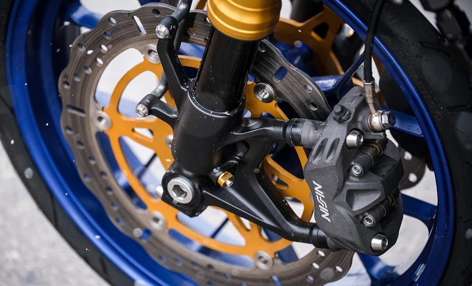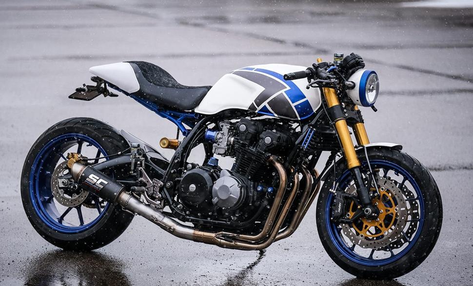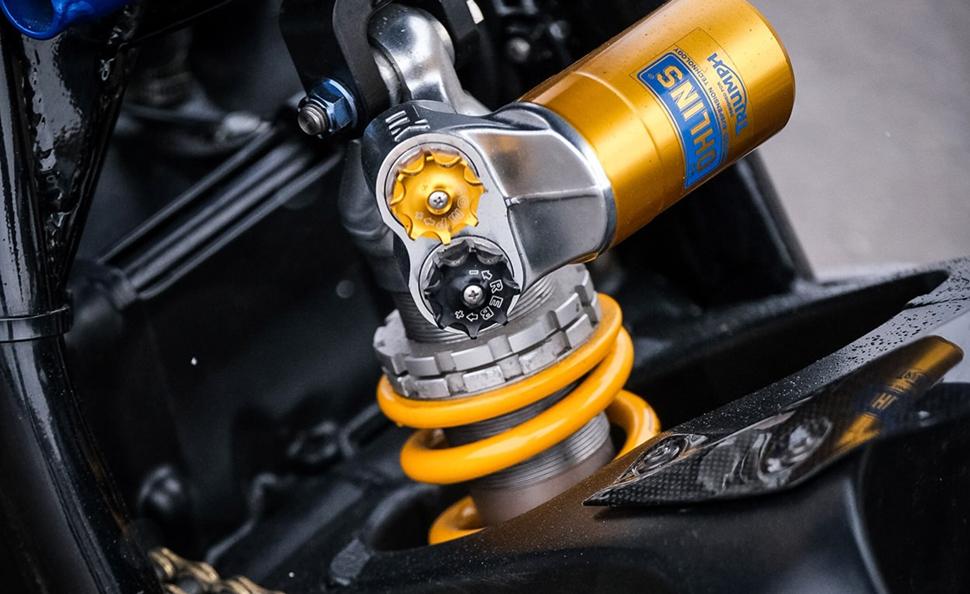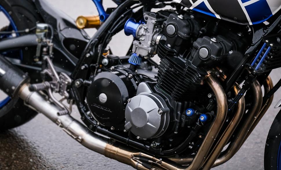 Сзади стоит маятник от Triumph Daytona 675R 2014 года, к которому прилажен топовый амортизатор Öhlins TTX через регулируемый рычаг. Колёса взяты с Aprilia RSV. Новая тормозная система CB - тоже сборная солянка: задний диск и суппорт взяты с Daytona 675R и приводятся мастер-цилиндром Nissin. На переднем тормозе диски - от EBC на кастомных проставках, суппорта - Nissin с Kawasaki ZX-14, а управляется всё это машинкой Brembo.