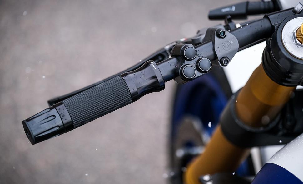 По всей тормозной системе используются титановые болты и армированные магистрали. А в пару тормозной машинке он подобрал рычаг сцепления от Brembo, установив их на клипоны, которые сделал сам из прямого руля.