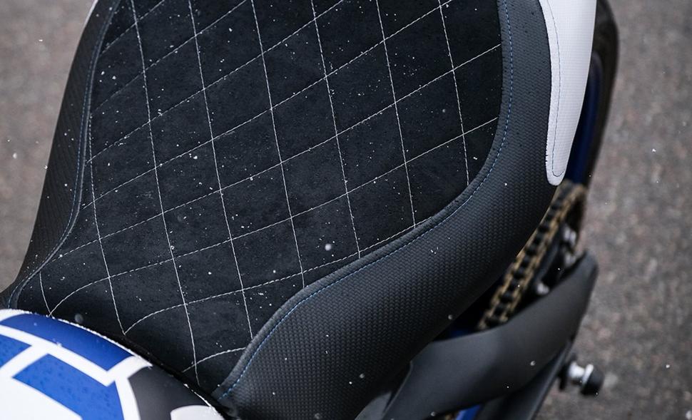 Если хвост кажется вам знакомым, то это потому, что весь подрамник и сиденье взяты от Ducati Monster 2012 года. Джеймс установил его на новые крепления, сделанные собственноручно, а затем отрезал 5 сантиметров хвоста и выровнял сиденье спереди. Обшивкой сиденья занялись Luimoto, но переднюю часть по просьбе Джеймса не прошили, чтобы он смог подогнать сиденье к баку с минимальным зазором.