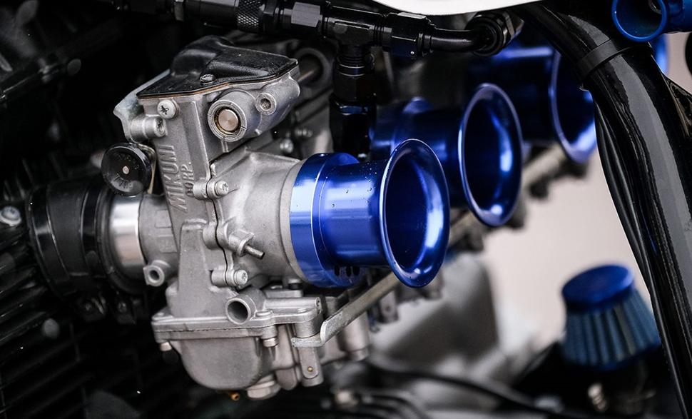 Залез он и в мотор, и причём довольно глубоко. В подробности вдаваться не будем, но упомянем увеличенные поршни, кастомное портирование головки, облегчённый и перебалансированный коленвал, любезно предоставленный командой APE Racing из Калифорнии. Также Джеймс установил цепи ГРМ Forseti Racing и обгонную муфту стартера от Yamaha R6.