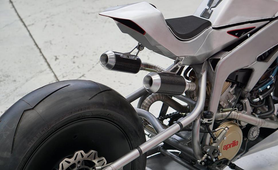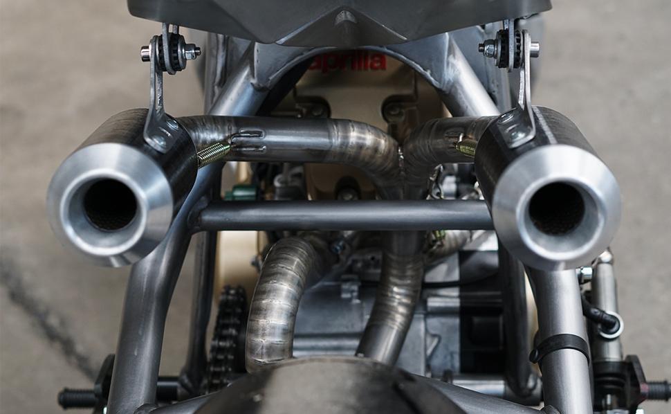 Двигатель Аprilia SXV550 - отличный, поэтому Симон оставил его в покое. Тем не менее, он создал собственную выхлопную систему из нержавеющей стали, которая извивается, как змея, прежде чем высоко выйти с двумя композитными глушителями под сиденьем. Каждый миллиметр выхлопной системы сделан вручную.