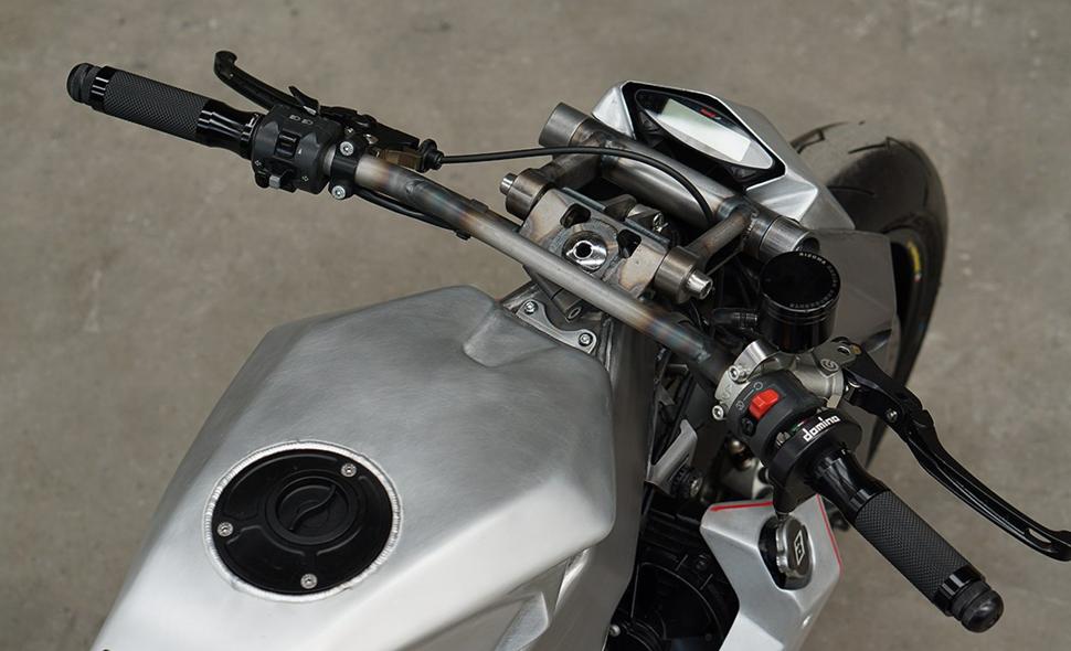Передняя подвеска скрыта обтекателями, которые Симон изготовил из цельного стального листа, завершает конструкцию изготовленный на заказ руль, цифровая панель Koso и тормозной цилиндр Rizoma, который работает с тормозами Brembo.