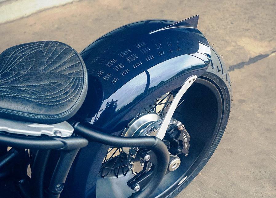 Выше стоят новые траверсы, в которых перья вилки разнесены достаточно, чтобы вместить между ними модернизированные колёса со ступицами и тормозами. Сама вилка - 43-миллиметровый Ohlins, а сзади стоит изготовленный под заказ амортизатор шведского бренда. Причём компоненты Ohlins тут далеко не только для престижа. Заказчик Бриса - заядлый энтузиаст гонок, и хотя это круизёр, он хочет, чтобы мотоцикл работал как можно эффективнее.