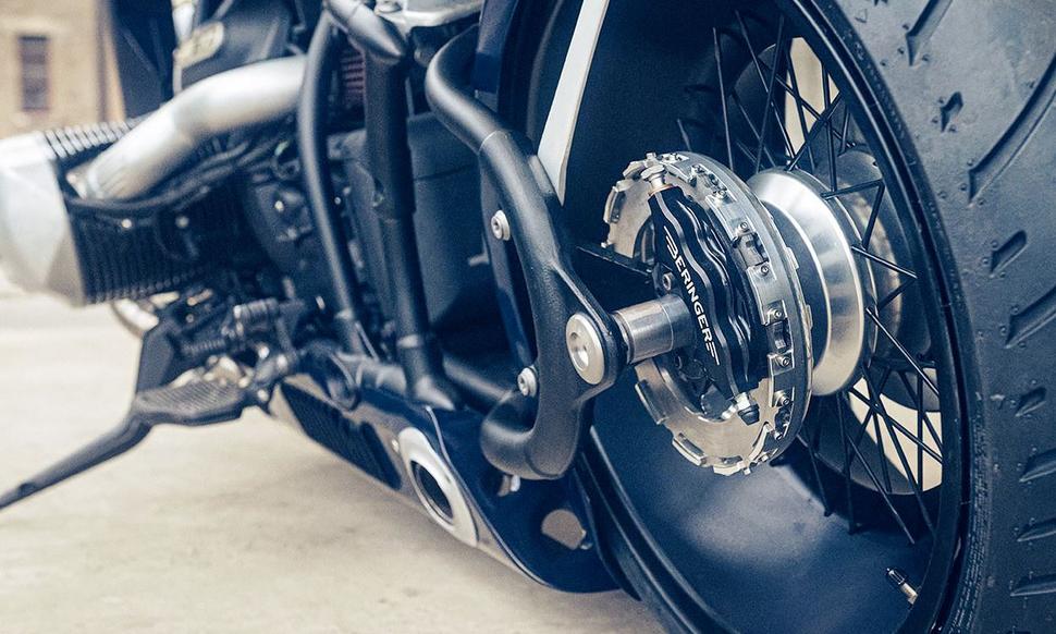 Обратите внимание на обратные рычаги, вдохновлённые оригинальным концептом BMW R 18. Брис здесь вновь обратился к Beringer, которые предоставили часть старого проекта, так и не завершённого. Брис подогнал их и проложил гидравлические магистрали внутри руля.