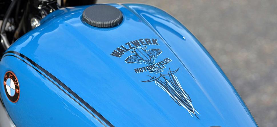Единственное цветное пятно — это бензобак голубого цвета, подсмотренного у Porsche 356. По бокам его украшают двойные пинстрайпы (окантовки) как дань уважения классическим BMW, а сверху - симпатичная графика.
