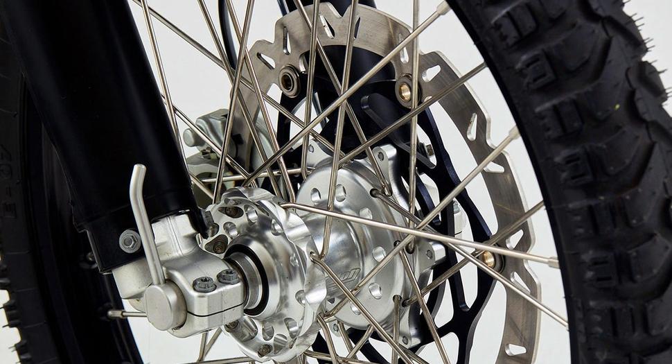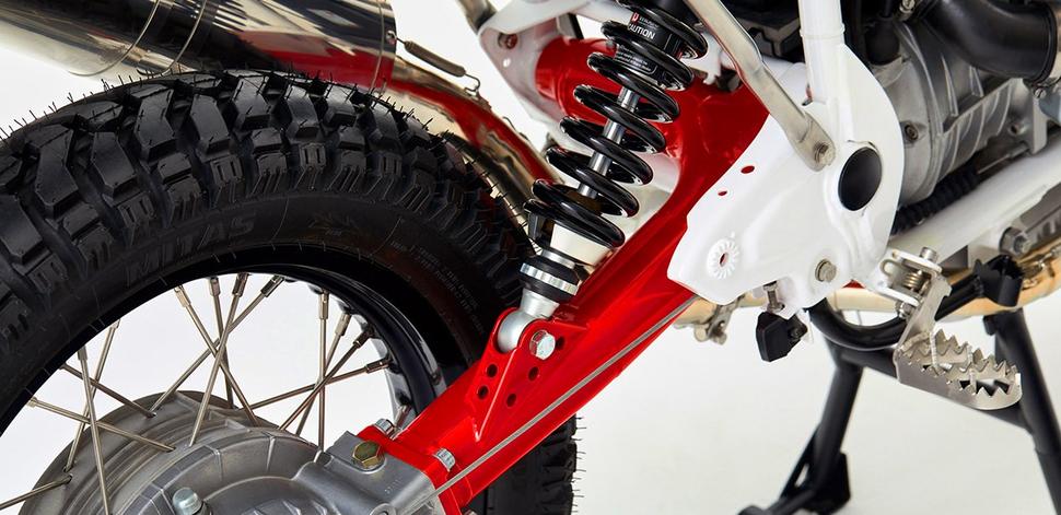 Колёса были обуты в резину двойного назначения Mitas E-07, причём благодаря более длинному маятнику назад встала 130-я резина. Под более высокие подвески пришлось переделать центральную подставку, получившую удобный рычаг для установки на неё мотоцикла.