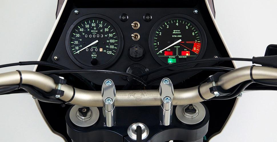 Родную приборную панель BMW R 80 ST Матиас установил на обтекатель Acerbis и дооснастил двухпортовым USB-зарядником, выключателем аварийки и переключателем схем зажигания. Потом установил руль от Magura на высокие проставки, оснастил защитой рычагов от Acerbis и зеркалами BMW.